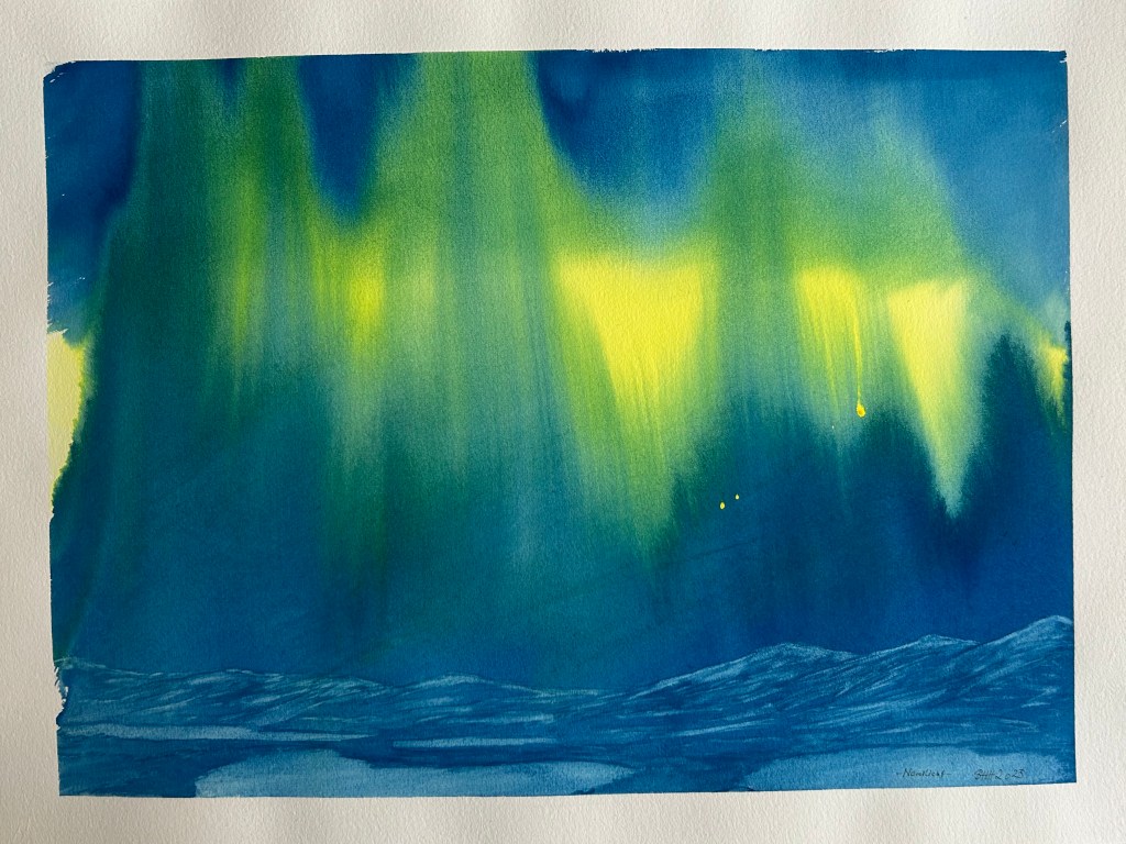 Brittisk mainly paints with watercolour. Her art is intuitive. Sometimes her paintings are abstract and playful, but mostly she paints landscapes inspired by the Norwegian nature.