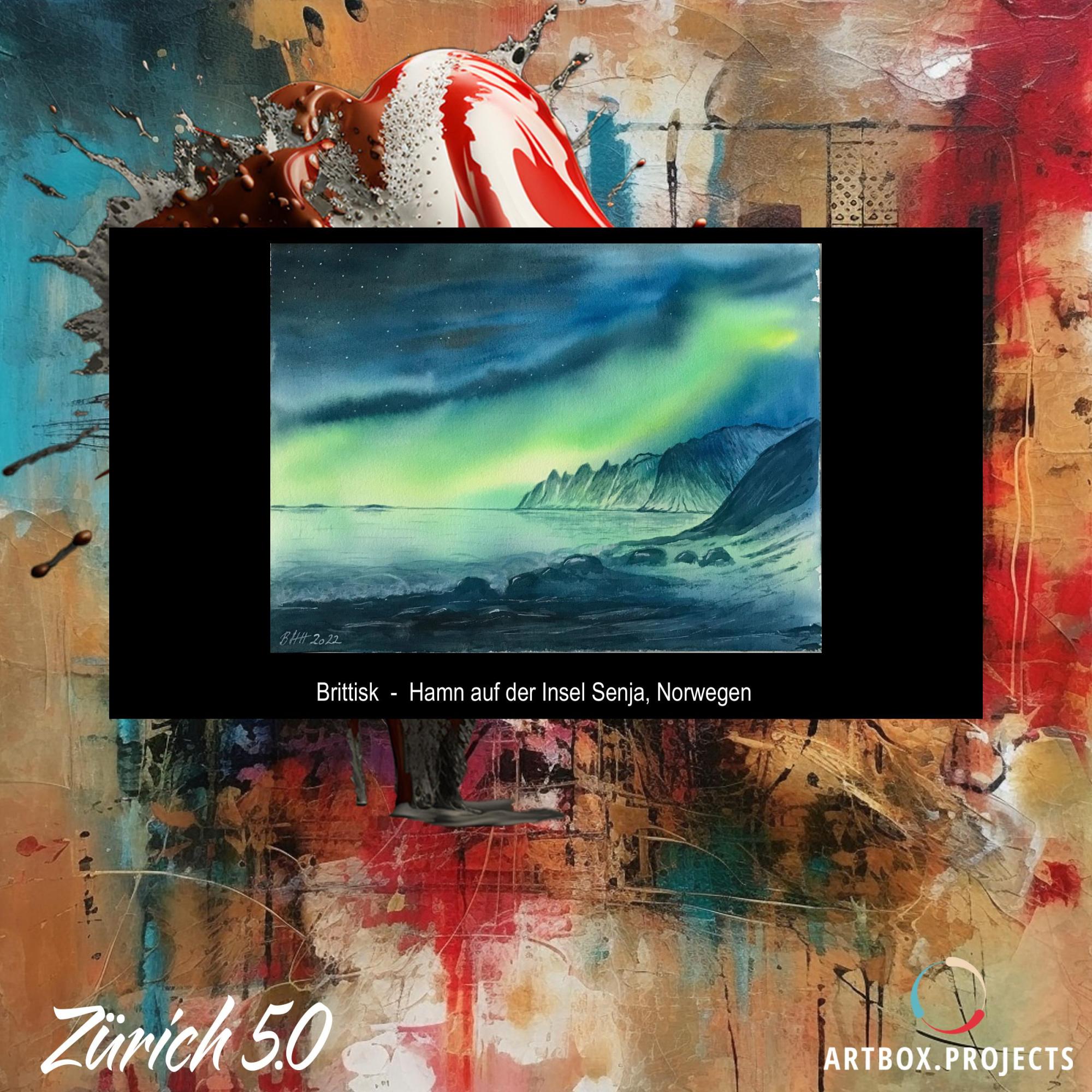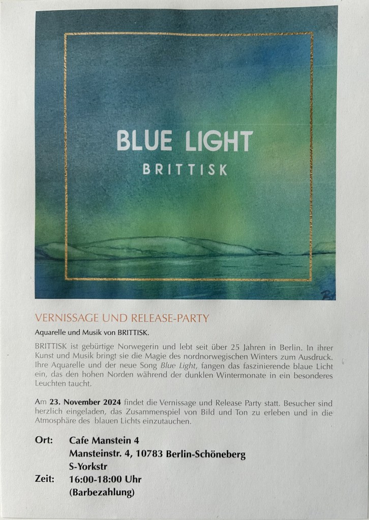 BRITTISK, originally from Norway, has been living in Berlin for over 25 years. Through her art and music, she expresses the magic of the Northern Norwegian winter. Her watercolors and her new song, Blue Light, capture the captivating blue glow that fills the far north during the dark winter months.